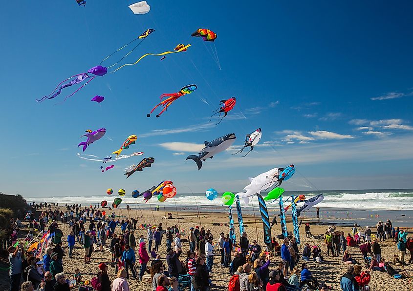 Festival degli aquiloni lungo la spiaggia di Lincoln City, Oregon. Credito immagine Bob Pool tramite Shutterstock