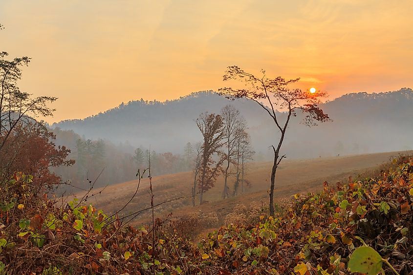 Alba a Robbinsville, Carolina del Nord, vicino alla foresta di Nantahala.