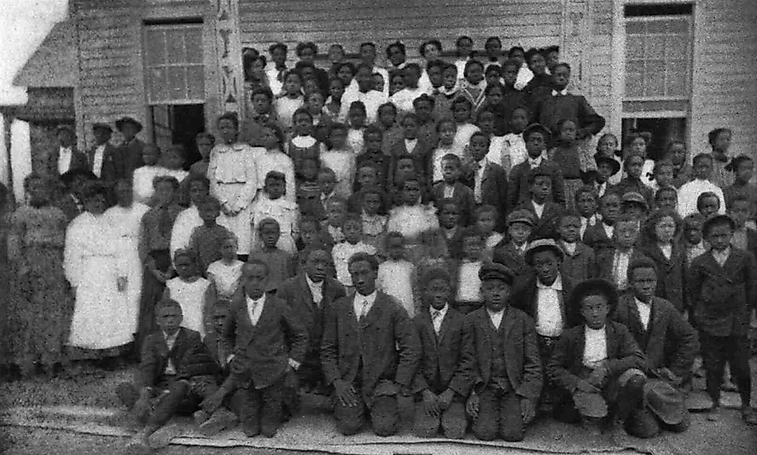 Foto di una storica scuola elementare nera americana, o "scuola normale", a Mound Bayou, c. 1910. Immagine: Wikimedia Commons, pub. Hartshorn, Penniman.