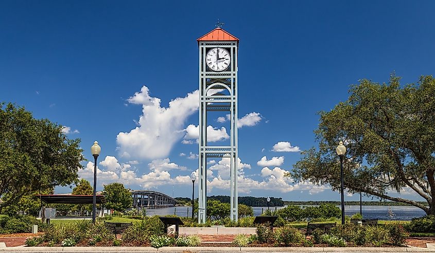 Torre dell'orologio al Riverfront Park a Palatka lungo il fiume San Giovanni.