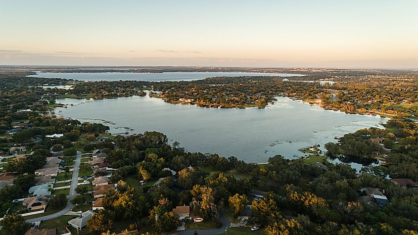 Vista dal drone del bellissimo lago Crescent della catena dei laghi di Clermont. Credito editoriale: Noah Densmore / Shutterstock.com