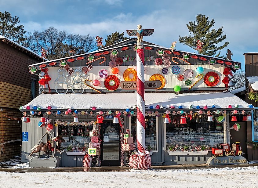 La facciata di un negozio addobbata per le vacanze di Natale in inverno a Nisswa, Minnesota, tramite Edgar Lee Espe / Shutterstock.com