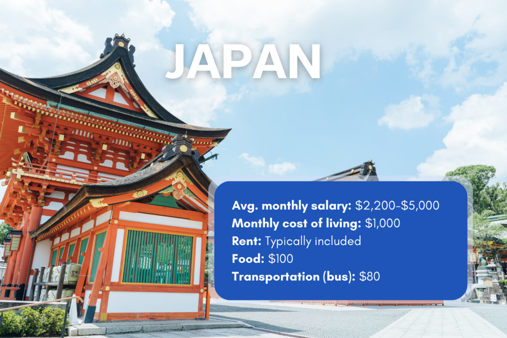 Il Giappone ha un costo della vita elevato rispetto agli Stati Uniti, che dovrebbe essere considerato quando si valutano potenziali destinazioni per insegnare l’inglese all’estero. Un individuo che vive in Giappone dovrebbe aspettarsi di pagare almeno 1.500 dollari al mese, rendendo estremamente desiderabili i programmi che forniscono sussidi per l’edilizia abitativa.