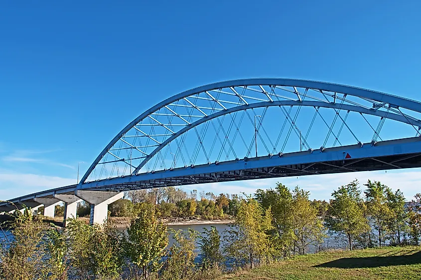 L'Amelia Earhart Memorial Bridge sul fiume Missouri ad Atchison, Kansas. Credito immagine Mystic Stock Photography tramite Shutterstock