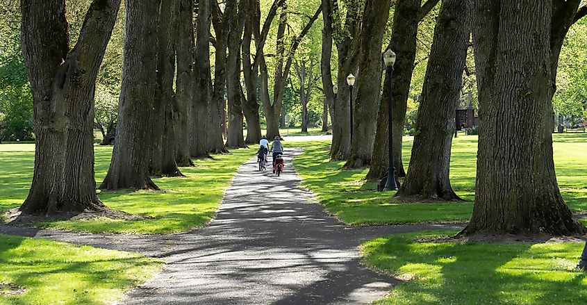 Una famiglia in bicicletta su una pista ciclabile a Corvallis, Oregon. Crediti editoriali: Bob Pool/Shutterstock.com.