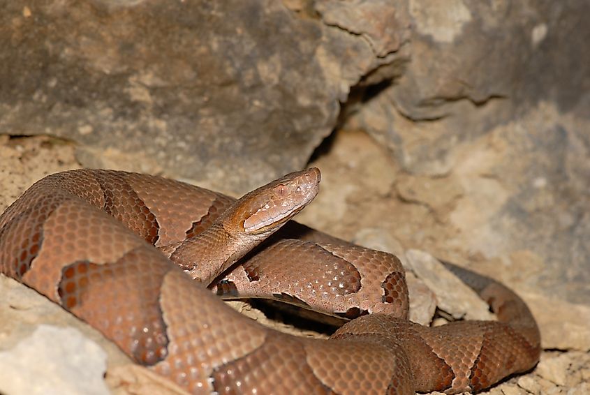 Un serpente osage dalla testa di rame attorcigliato accanto a una grande parete rocciosa.