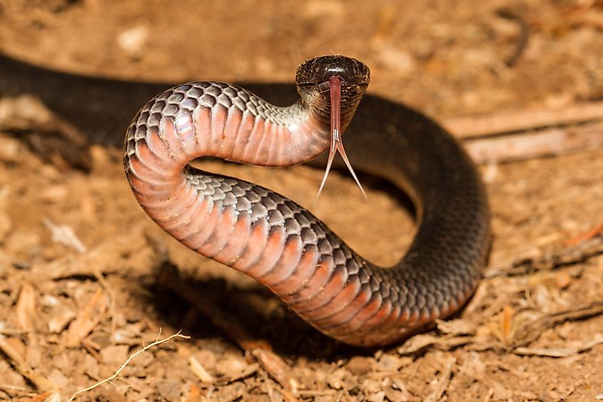Un serpente nero dal ventre rosso con la lingua fuori.