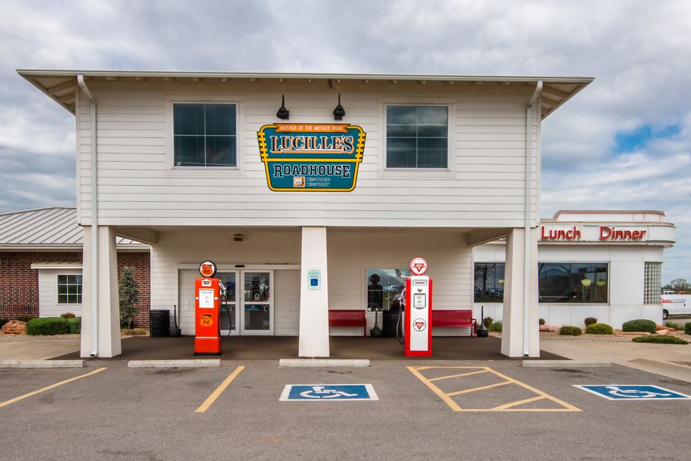 OJantar Roadhouse de Lucilleé outro pit stop retrô famoso (e cheio!) ao longo de uma estrada da Rota 66. Com uma história que remonta a um modesto posto de alimentação em 1927, o local foi adquirido e desenvolvido por Lucille e Carl Hamons como uma empresa familiar. Hoje, serve especialidades com hash browns ilimitados, Route 66 Classic como o Breakfast Sandwich, ePanquecas à vontade por US$ 5,99.