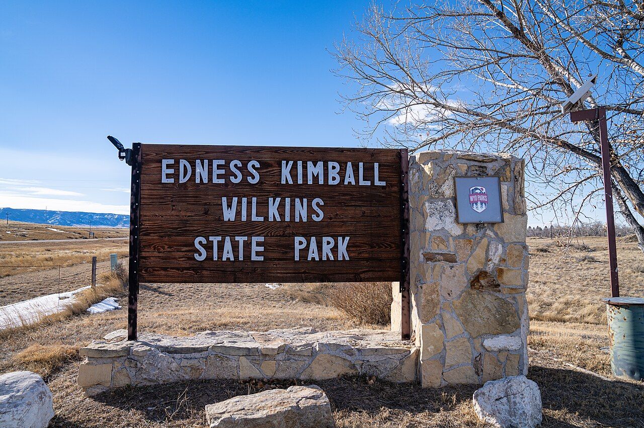 Sinalização para o Parque Estadual Edness Kimball Wilkins no condado de Natrona, Wyoming.