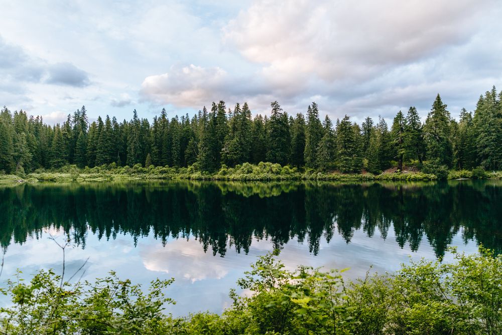 Um reflexo das árvores em Clear Lake, na Floresta Nacional Willamette, Oregon