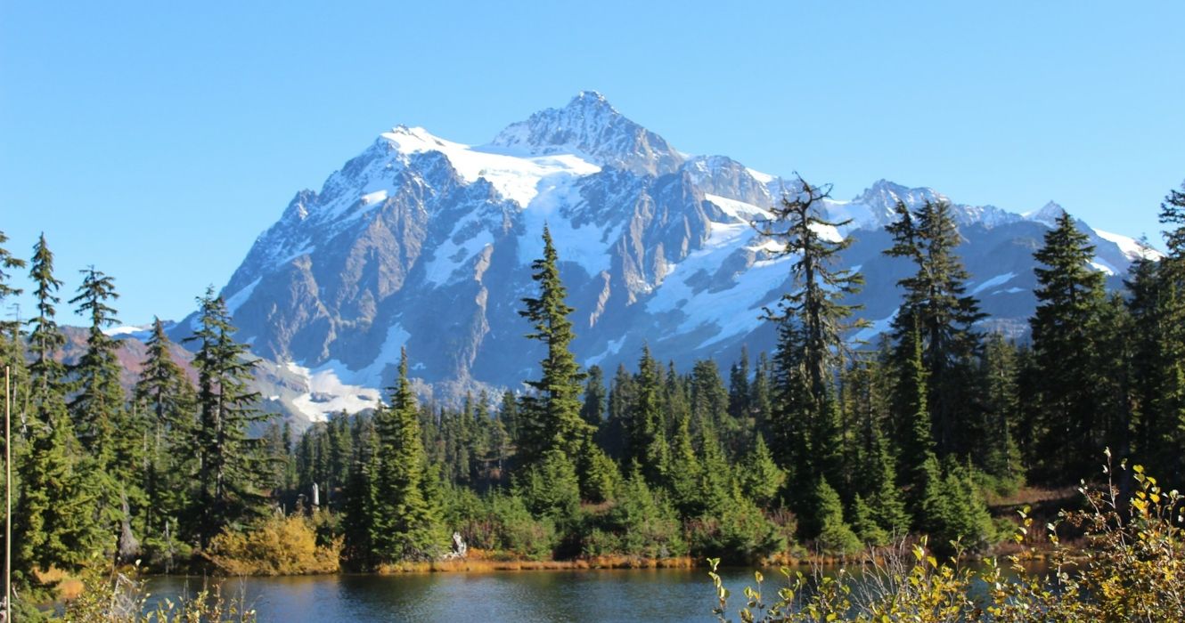 Vista do Monte Baker coberto de neve ao longe, estado de Washington