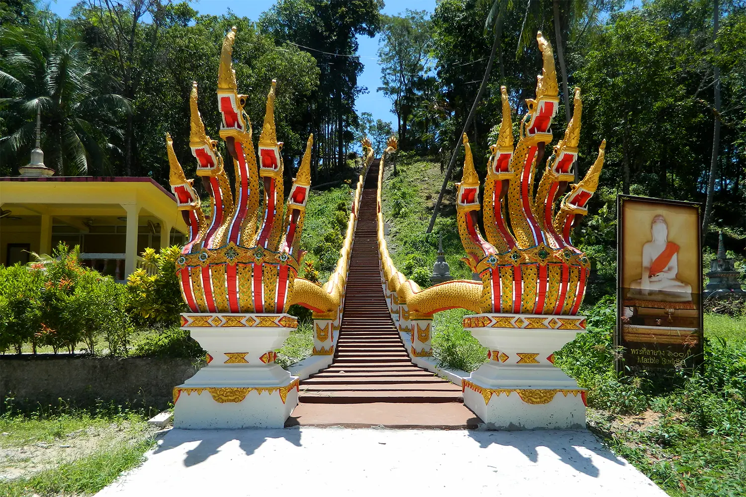 Wat Maduea Wan é uma atração turística maravilhosa em Koh Phangan para admirar a arquitetura dos templos budistas e tirar uma foto digna do Instagram (desde que você seja respeitoso durante o culto!). Suba a icônica escadaria Naga e medite no topo, converse com um monge ou simplesmente aprecie os belos detalhes ornamentados do templo.