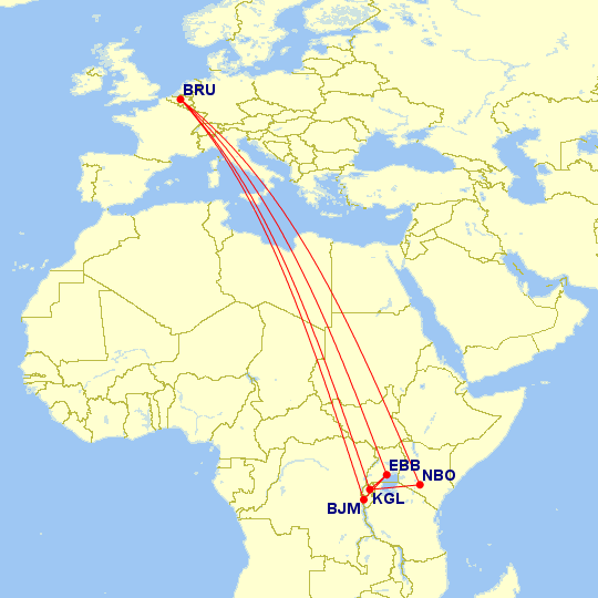 Este voo tem então ligação a Kampala, garantindo que a capital do Uganda tem um serviço diário para Bruxelas devido aos voos provenientes da KGL e BJM.