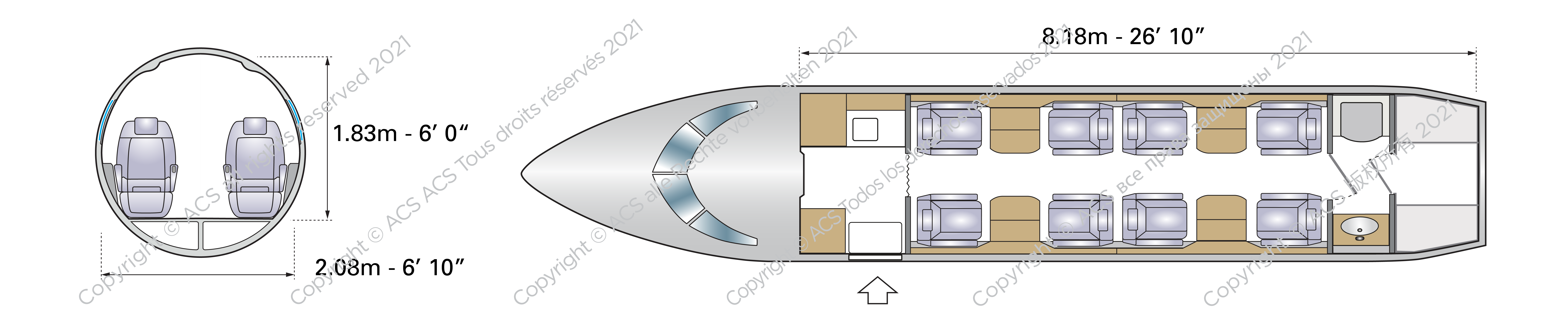 Projetada para transportar de oito a doze passageiros e uma tripulação de duas pessoas, a cabine espaçosa permite um movimento confortável dentro da aeronave. Para aeronaves de seu tamanho na época, esta foi a primeira vez e pode ter ajudado a influenciar os designs de cabine maiores de muitos jatos particulares leves “pesados” de longo alcance que se seguiram, alguns dos quais com cabines de mais de dois metros de altura. Para obter mais informações sobre jatos particulares pesados, consulte nosso artigo aqui.