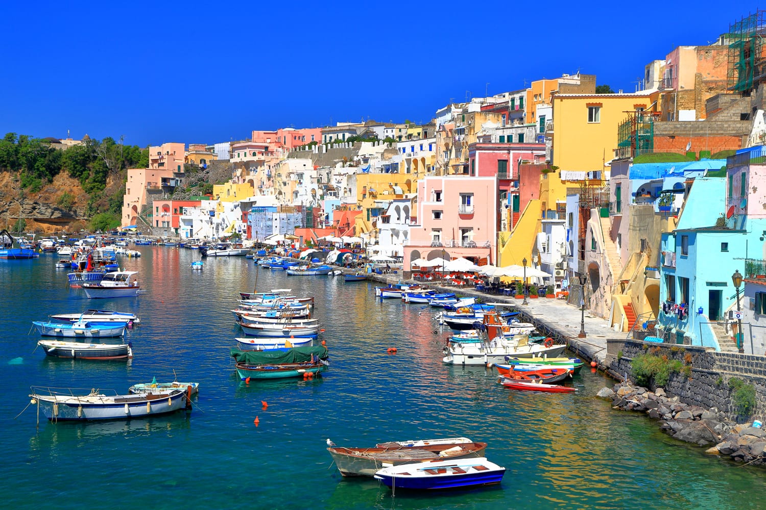 Casas radiantes ao lado do porto destacam este paraíso mediterrâneo. Embora as casas azuis, amarelas, rosa e verdes preencham o rolo da câmera durante o dia, você vai adorar ver o céu se transformar em uma mistura majestosa de amarelo, rosa, azul e laranja quando o sol se põe.