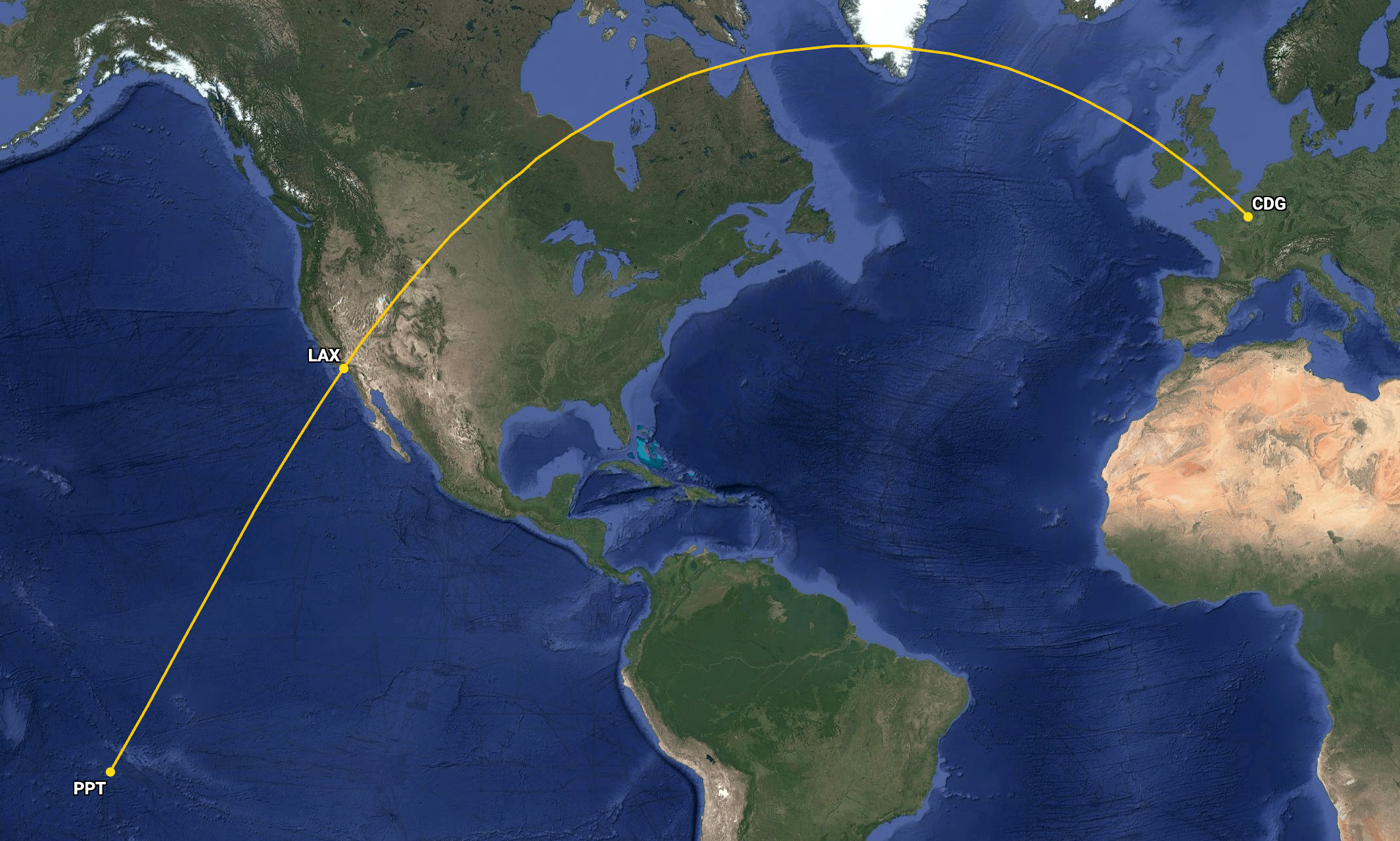 (CDG) para o Aeroporto Internacional Papeete Fa’a’ā (PPT), servindo o Taiti, Polinésia Francesa, via