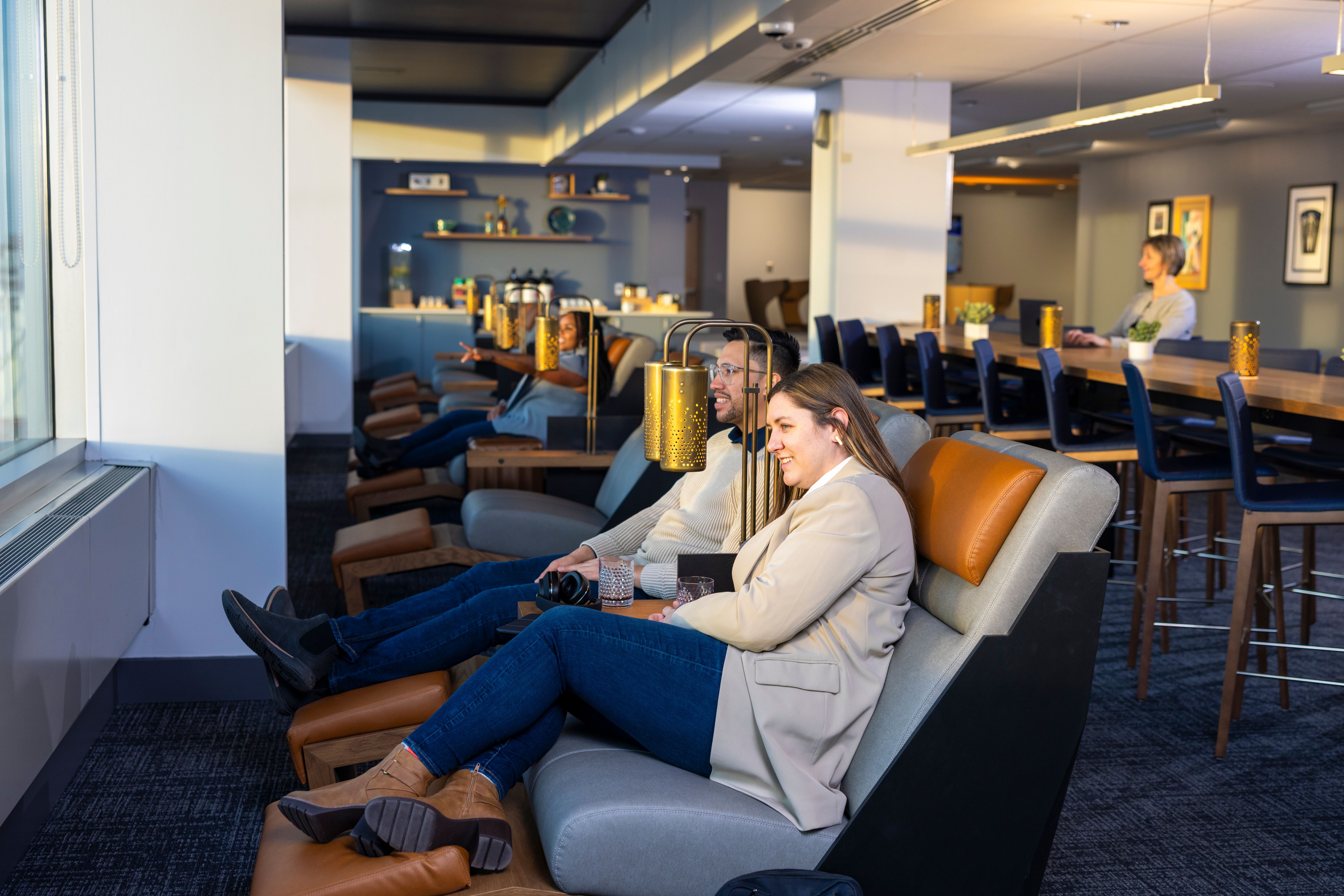 Os hóspedes também ficarão satisfeitos em descobrir que a maioria dos assentos fica pertotomadas elétricas, permitindo-lhes sentar e relaxar enquanto seus dispositivos também são recarregados. A experiência continua com o Lounge servindo uma seleção diária de alimentos frescos e sazonais e bebidas premium de cortesia, incluindo expressos artesanais e uma seleção selecionada de vinhos da Costa Oeste, cervejas artesanais e coquetéis personalizados.