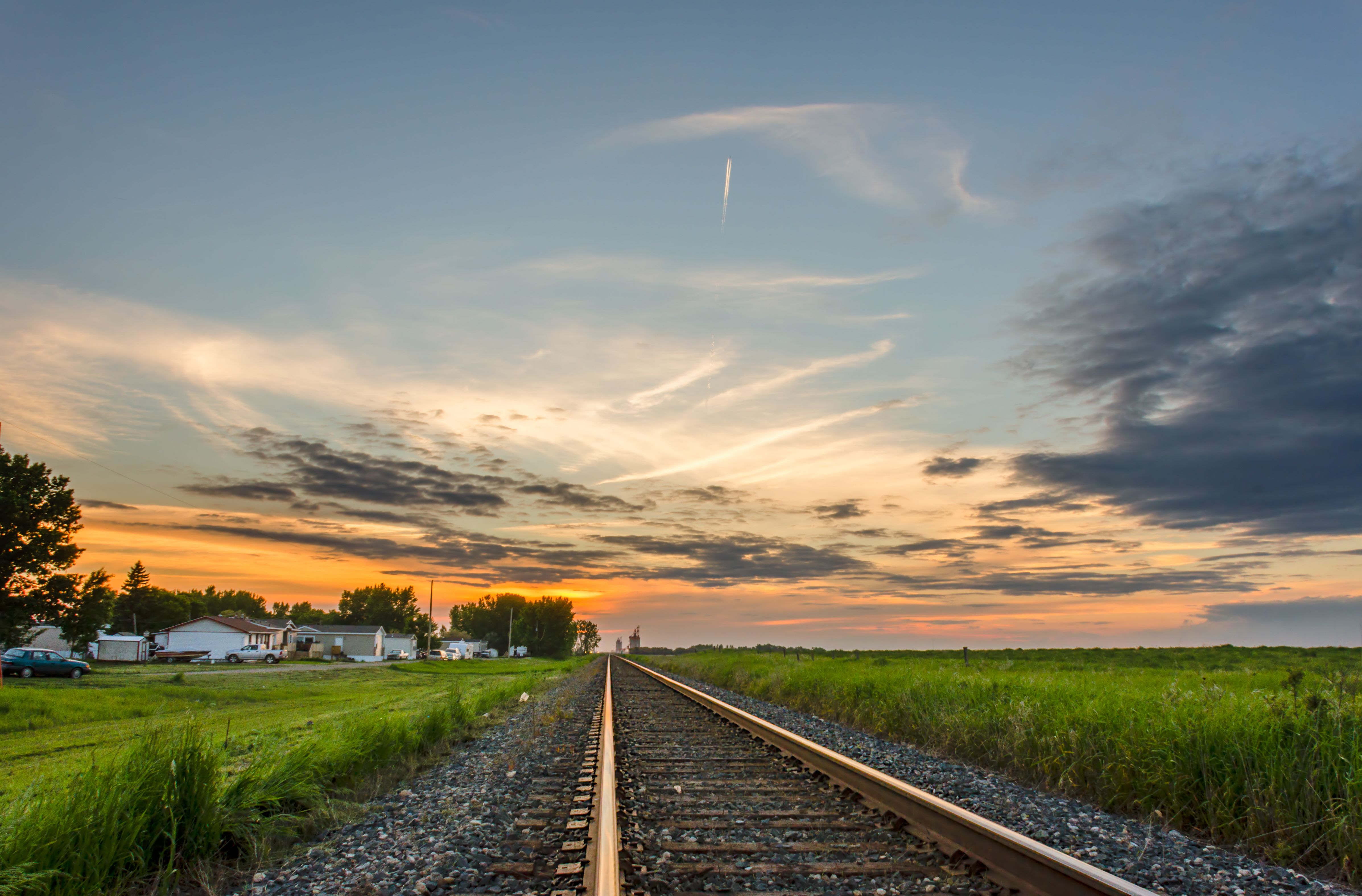 Noite na cidade, retirando-se para longe em direção ao pôr do sol, Saskatchewan, Canadá