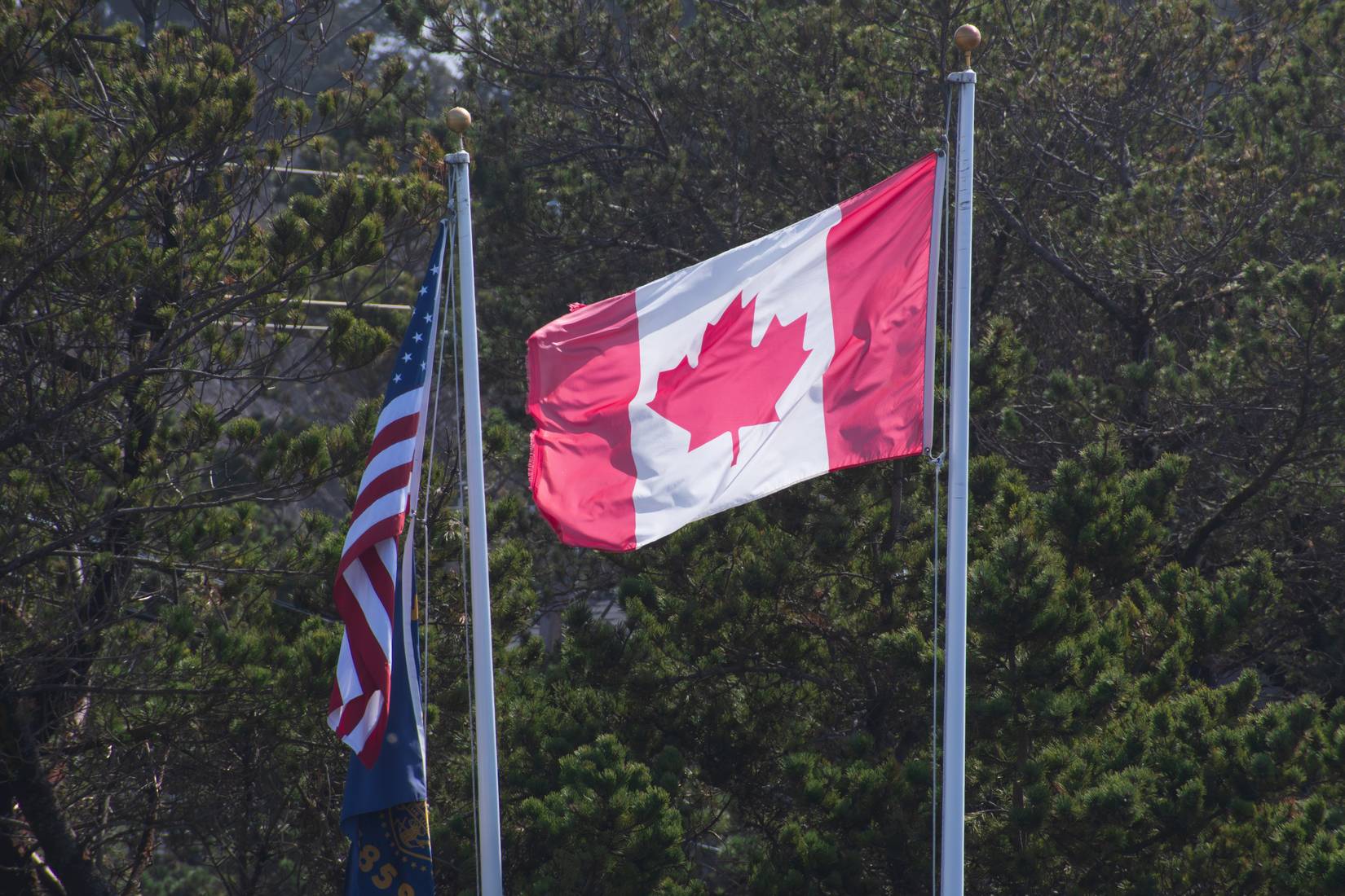 Uma bandeira americana e uma bandeira canadense são vistas em Seattle, Washington, Estados Unidos.