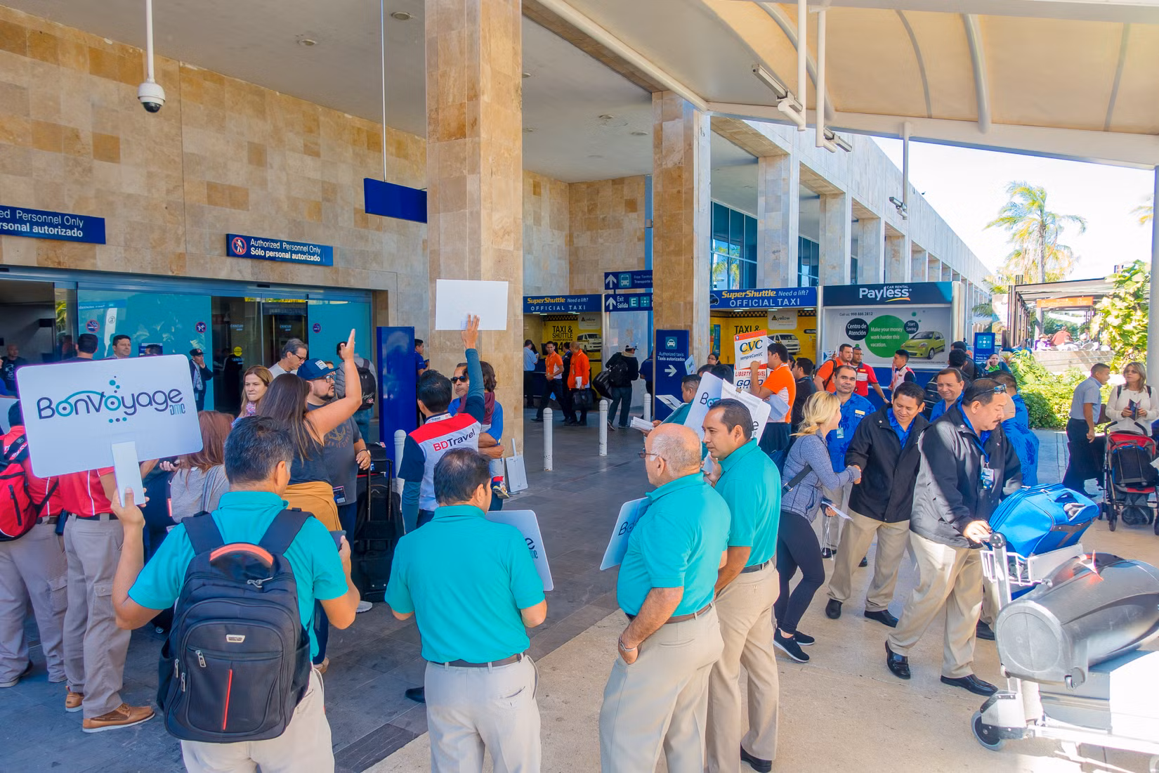 Pessoas não identificadas com placa com nomes de turistas que chegaram ao aeroporto de Cancún na entrada do Aeroporto Internacional de Cancún, México. Crédito: via Shutterstock
