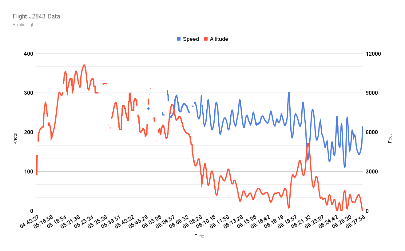 Os dados ADS-B mostram que a altitude da aeronave oscilou durante quase 75 minutos antes do acidente, flutuando repetidamente até ±8.000 pés às vezes. Além disso, sua velocidade vertical e velocidade de solo também eram altamente erráticas. Isto aponta para uma perda dos controles primários de voo, com os pilotos usando o impulso do motor para controlar o avião. Abaixo está um instantâneo de alguns dos dados em momentos diferentes: