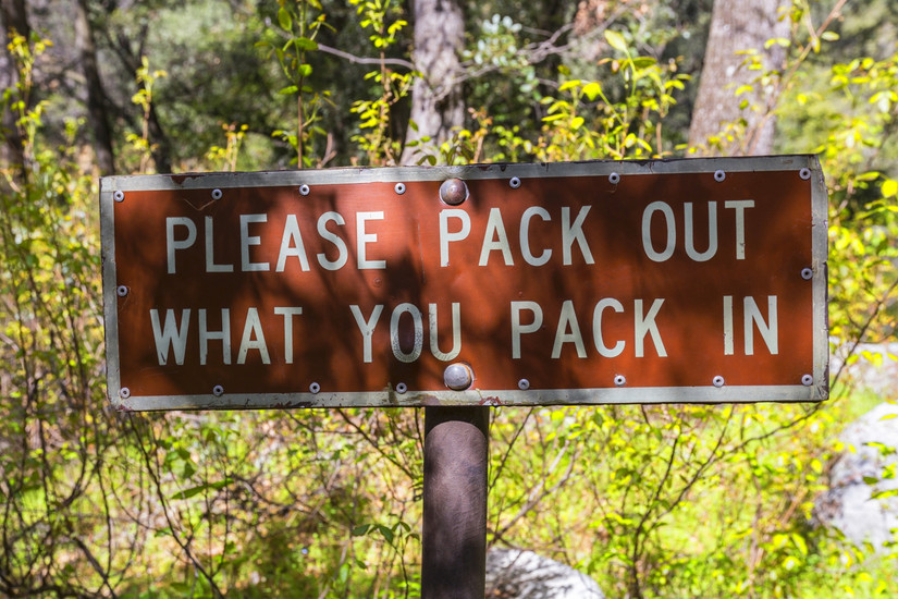 Placa de alerta de lixo “Por favor, embale o que você embala” em uma Floresta Nacional da CalifórniaCrédito: Shutterstock