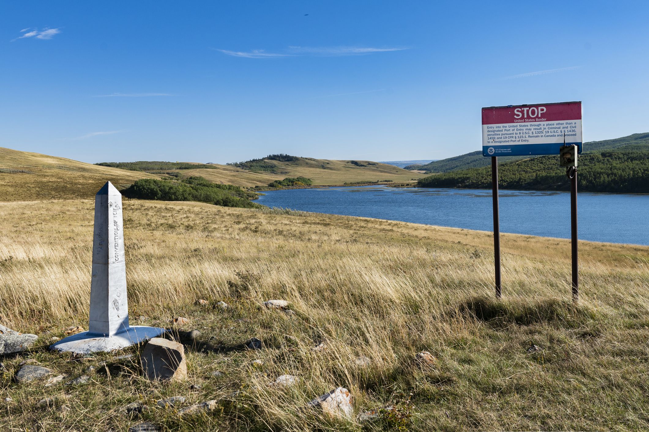 Marcador de fronteira do tratado na fronteira entre Montana, Estados Unidos, e Alberta, Canadá