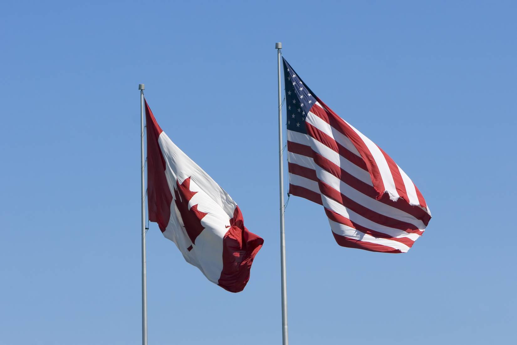 Bandeiras do Canadá e dos EUA contra um céu azul claro. Crédito: via Shutterstock