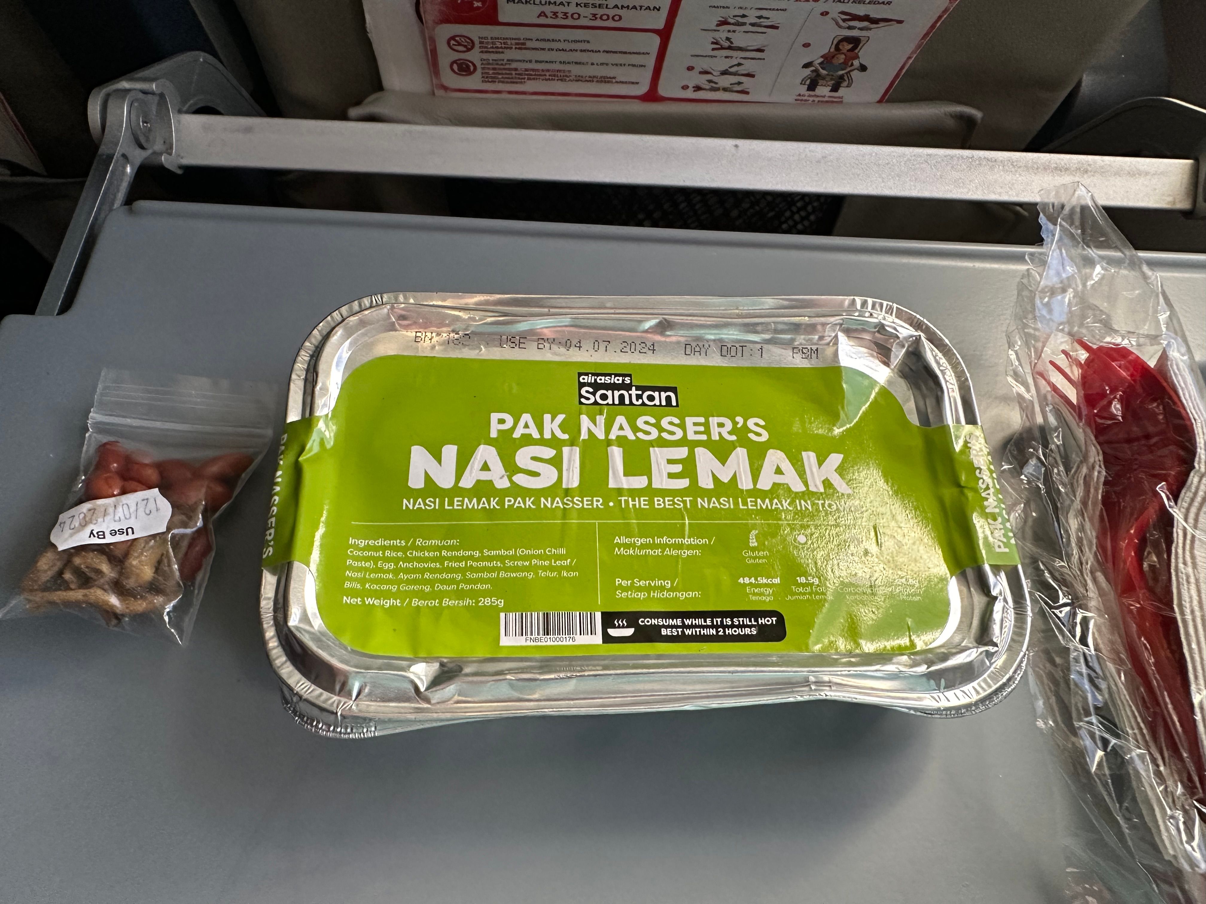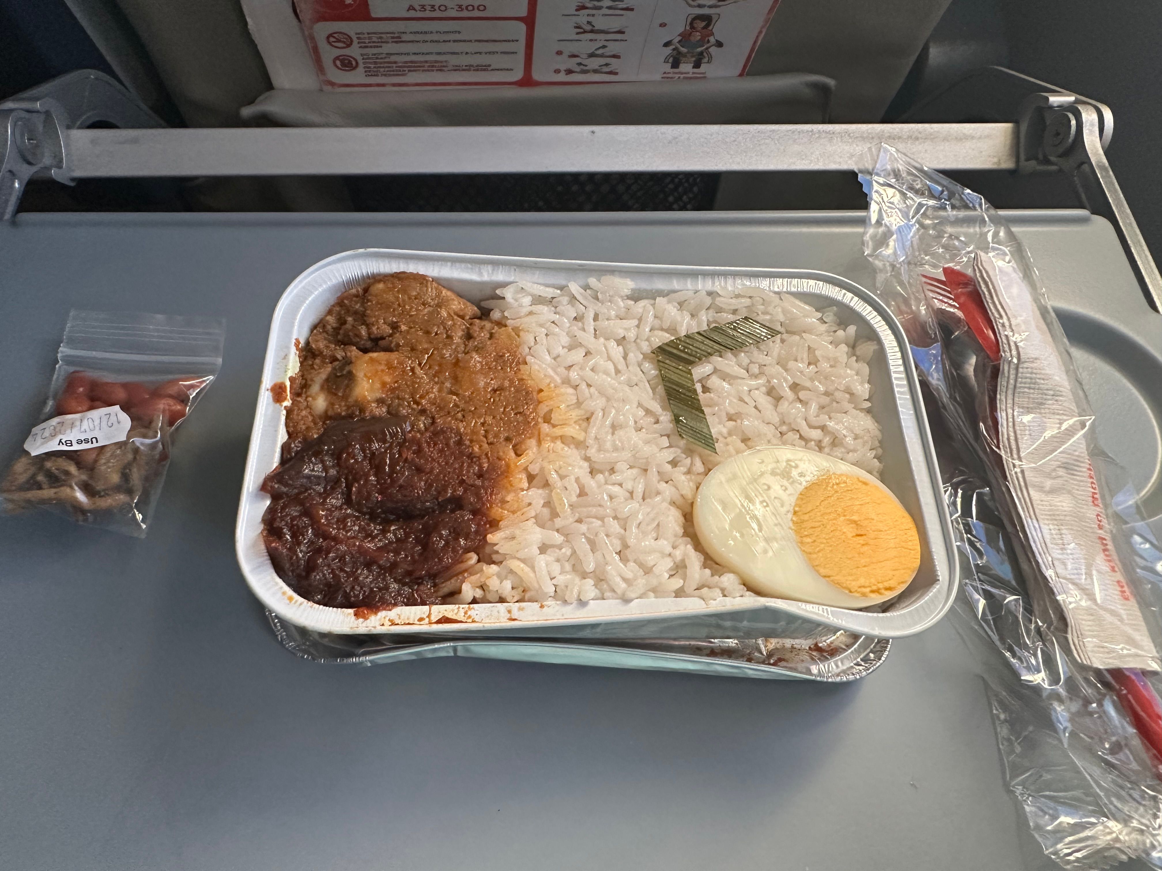 A segunda refeição que pedi foi um tradicional Nasi Lemak, um autêntico sabor da Malásia que começou como um prato para os agricultores recuperarem energia para o trabalho no campo. A versão AAX traz arroz com infusão de coco com sambal de cebola, frango Rendang, ovo cozido, anchovas fritas e amendoim.