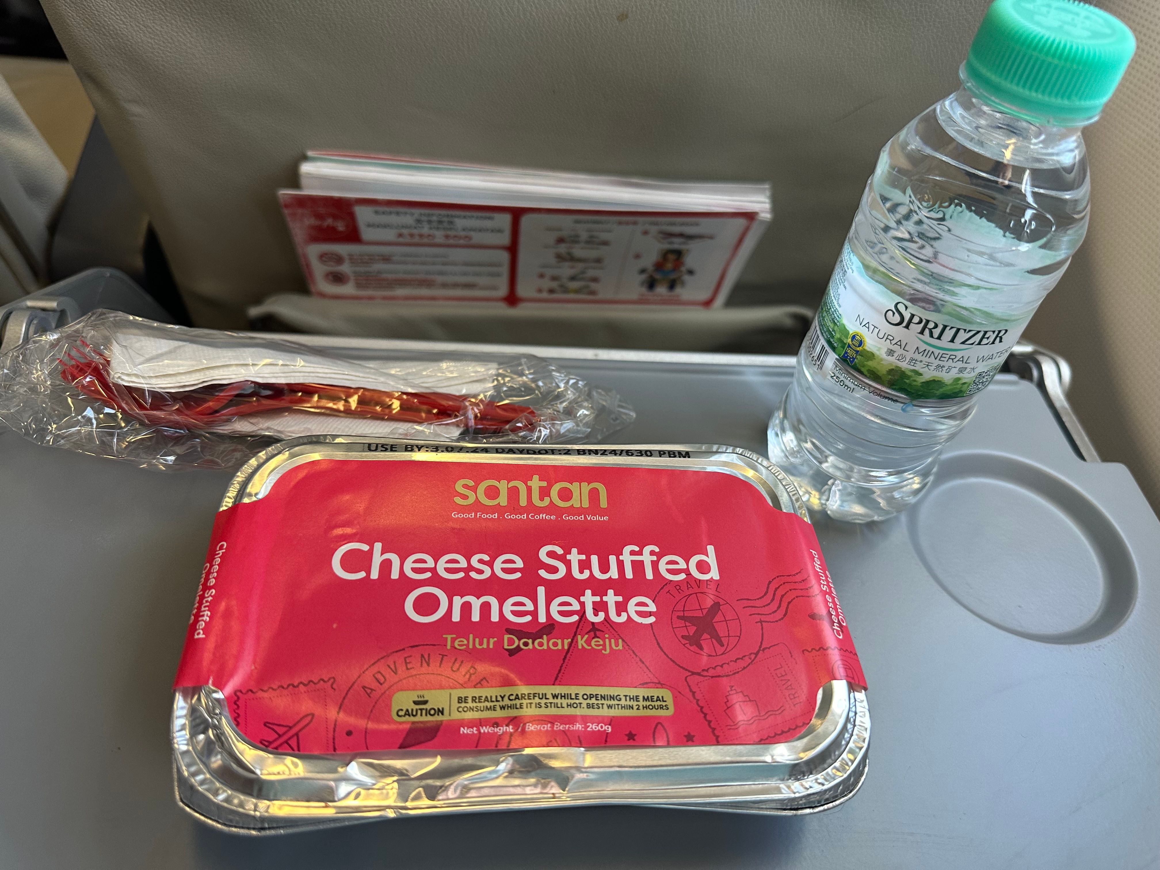 Encomendei duas refeições para este voo, sendo a primeira servida uma hora após o início do voo e a segunda duas horas antes da chegada a Melbourne. A primeira foi uma omelete recheada de queijo com linguiça, fricassé, tomate e cogumelos ao molho cremoso, servida com garrafa de água.