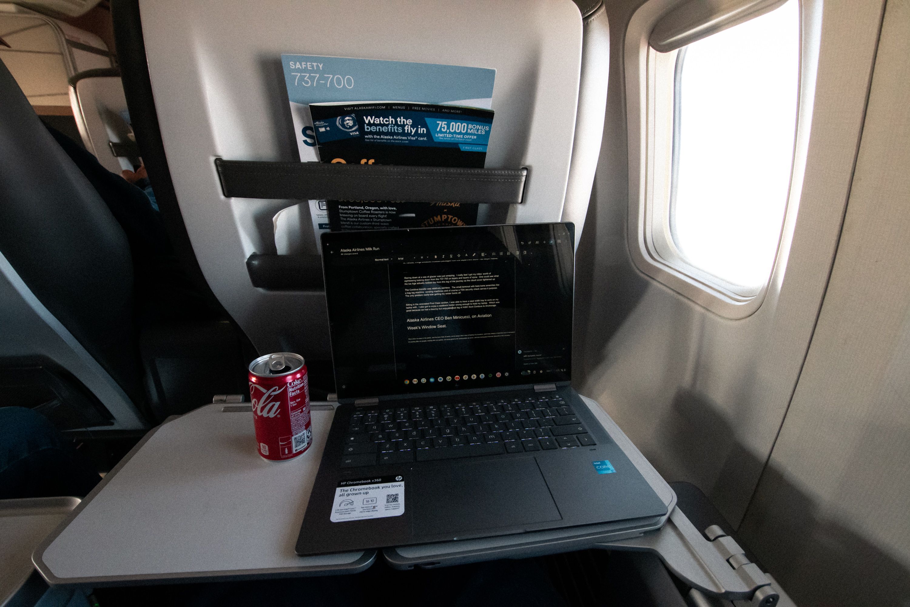 Sentado na seção reformada da primeira classe, consegui uma bandeja da largura do assento para trabalhar no meu laptop. Também gostei de um suporte de encosto forte o suficiente para segurar meu laptop – o que foi bom porque tivemos uma última etapa animada, mas agradável, do AS61 de Cordova a Anchorage, onde subimos acima das nuvens. Você pode ver abaixo que consegui usar a bandeja para digitar algumas primeiras impressões e beber uma Coca-Cola grátis: