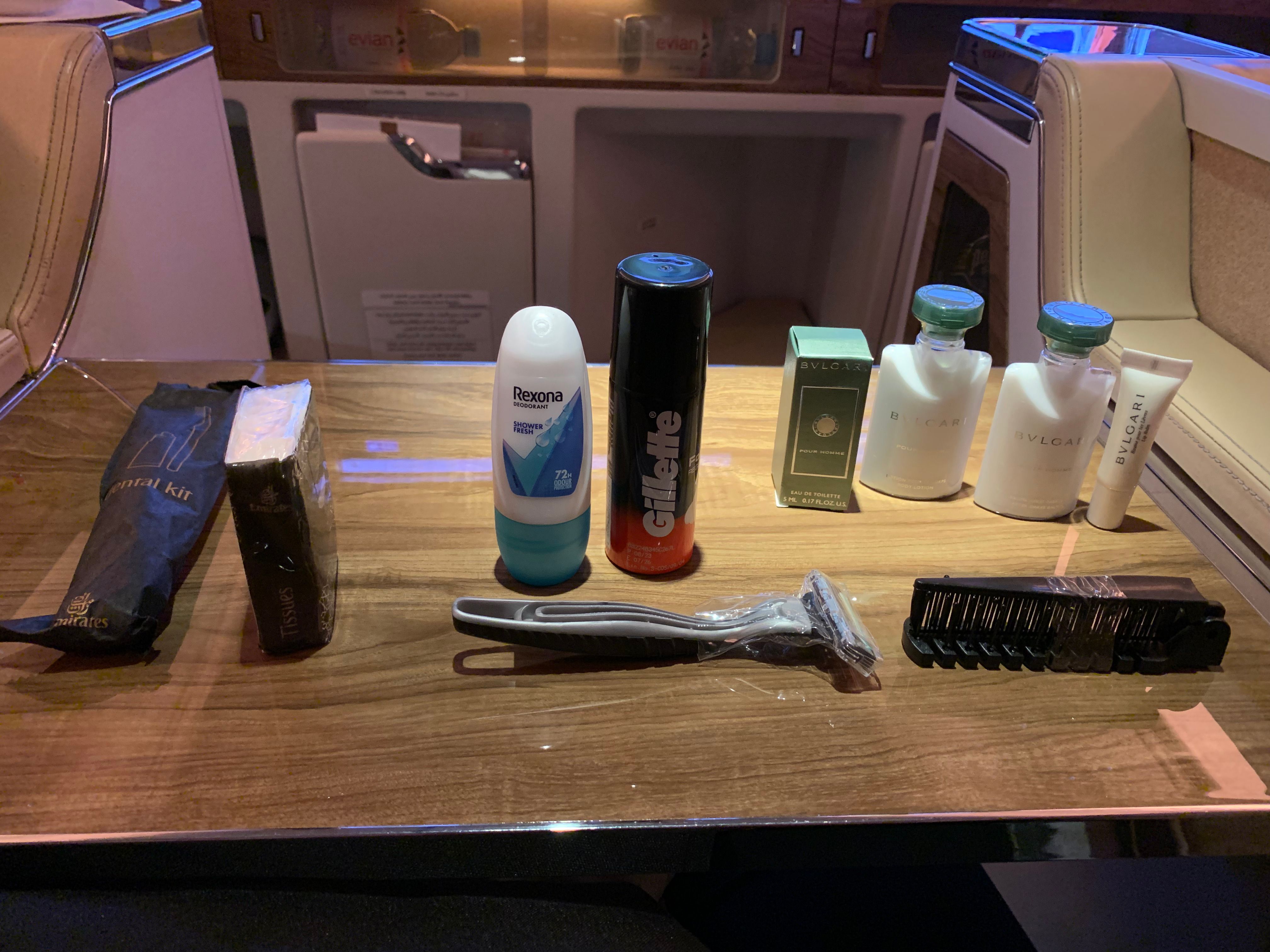 Dentro do kit, você pode encontrar muitos produtos úteis que são úteis ao voar durante a noite. O kit inclui Eau De Toilette BVLGARI, loção corporal, bálsamo pós-barba e protetor labial, feitos exclusivamente para a Emirates. Além disso, você encontra desodorante roll-on, espuma de barbear, lâminas de barbear, pente de cabelo, kit odontológico e pacote de lenços faciais.