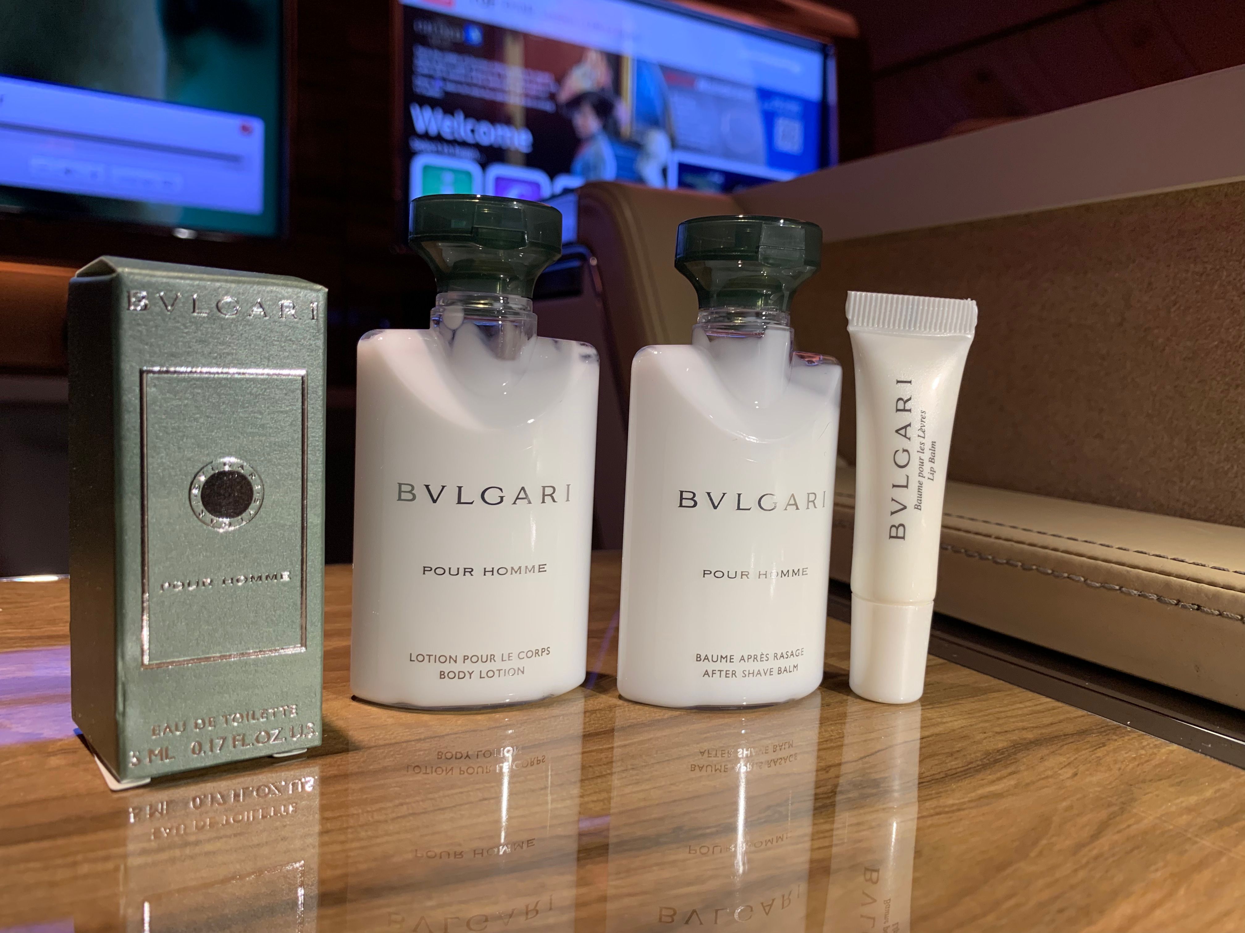 A Emirates tem parceria há muito tempo com a marca de luxo BVLGARI para os kits de amenidades fornecidos aos passageiros executivos e de primeira classe. Os kits são constantemente atualizados com novos aromas BVLGARI feitos exclusivamente para passageiros da Emirates.