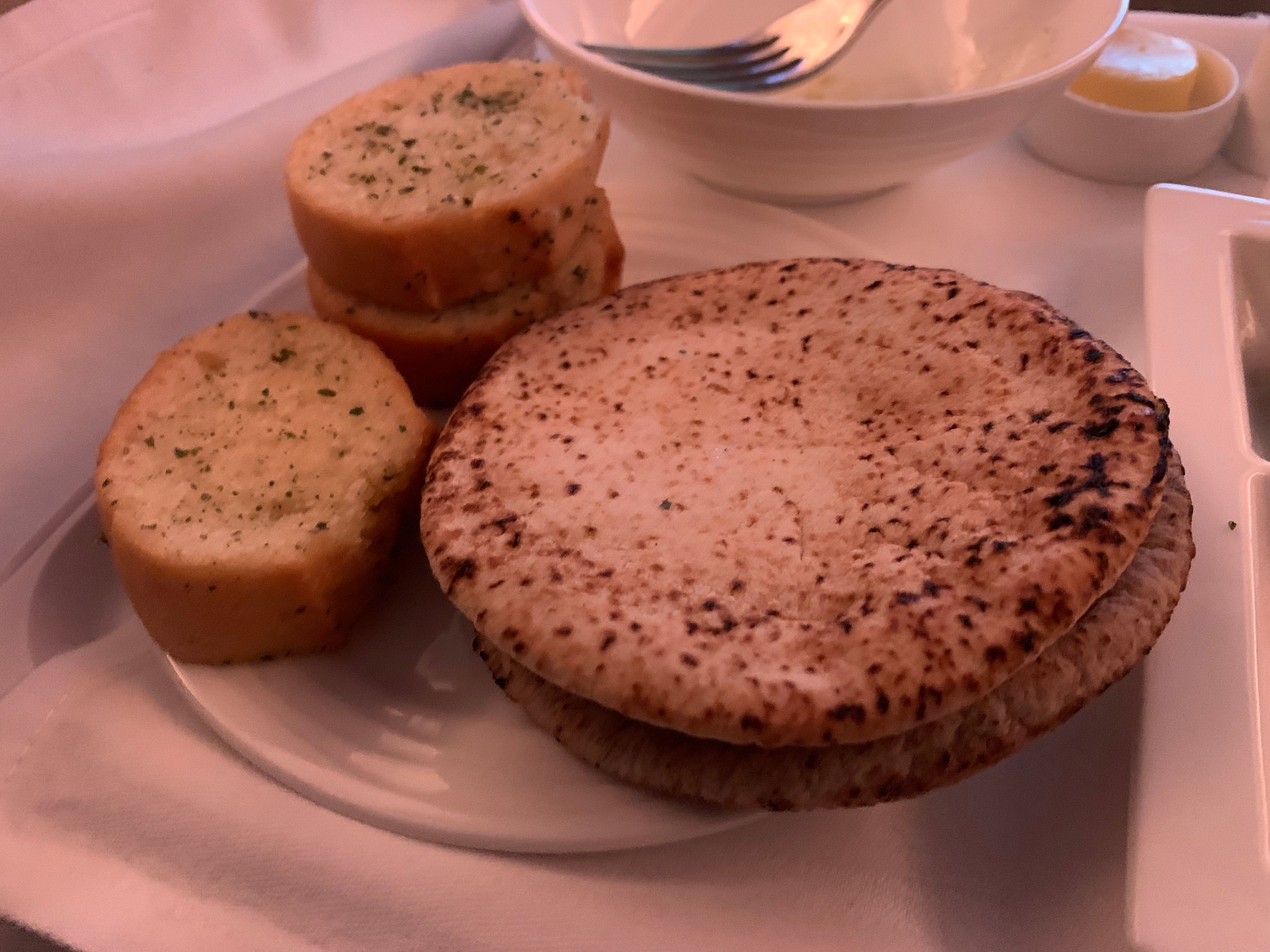 Para o drink pós-decolagem, tomei um copo de mojito virgem junto com uma mistura de nozes. Para o jantar de três pratos, escolhi o Mezze Árabe Tradicional como entrada, o Filé de Carne Grelhado como prato principal e o Cheesecake de Chocolate Branco como sobremesa. O jantar é servido com uma tigela de salada fresca e uma seleção de pães quentes.