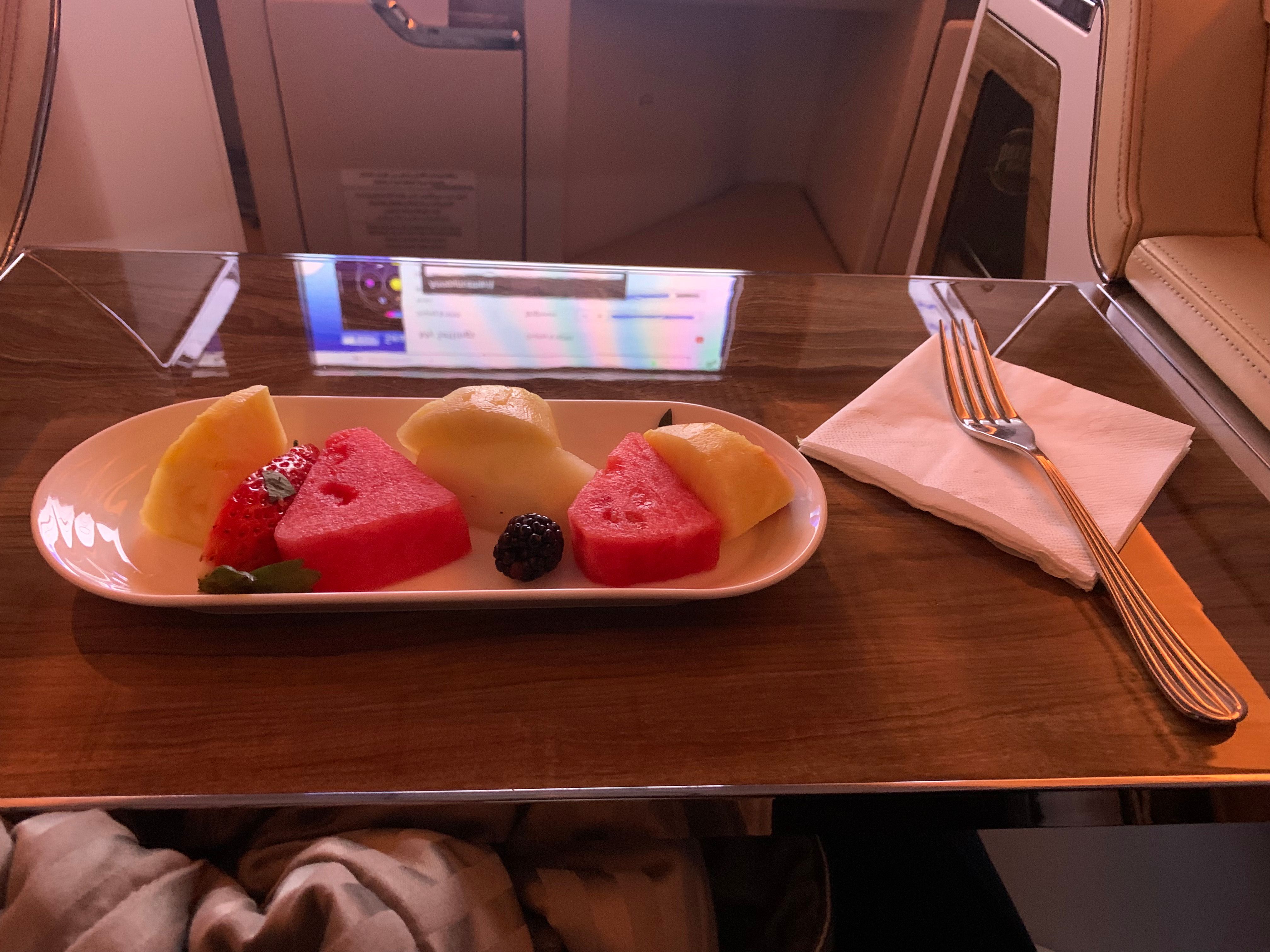 Além disso, o fato de o tripulante estar disposto a reservar um prato de frutas improvisado apenas para mim, para ser servido como um mini-café da manhã antes do pouso, mostra a excelência no serviço das equipes da tripulação de cabine da Emirates e mostra que eles estão dispostos a ir além para atender às solicitações dos passageiros.