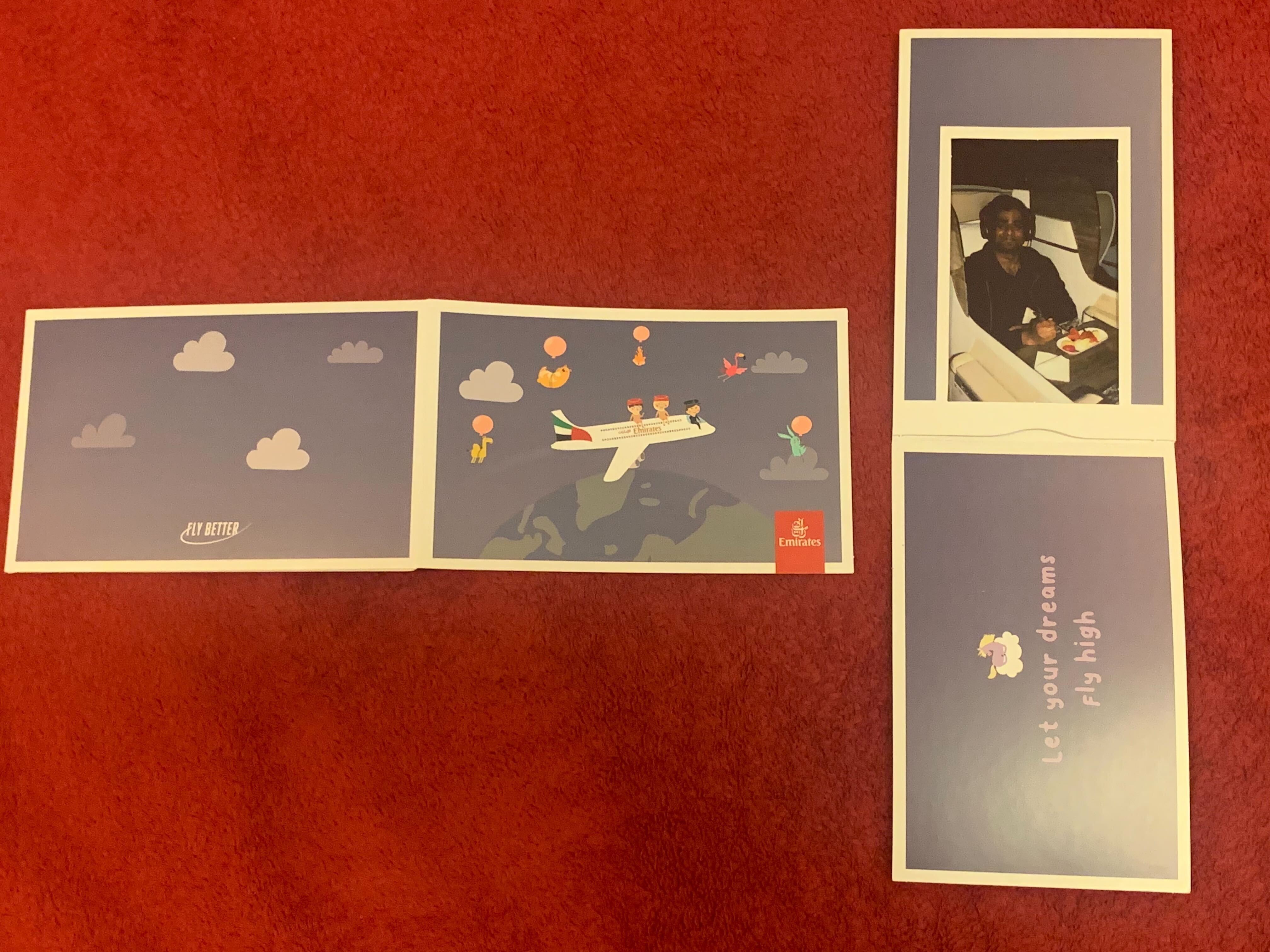 Como é minha tradição ao voar com a Emirates, tive que tirar algumas fotos Polaroid, uma especialidade da Emirates que é gratuita para todos os passageiros em todas as classes de viagem. Pequenas coisas como essas tornam o voo ainda mais memorável, pois essas fotos são colocadas em lindas molduras que os passageiros podem levar para casa como lembrança.