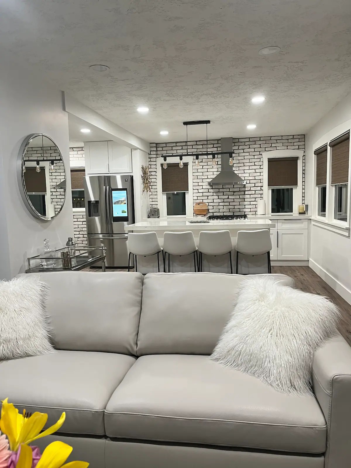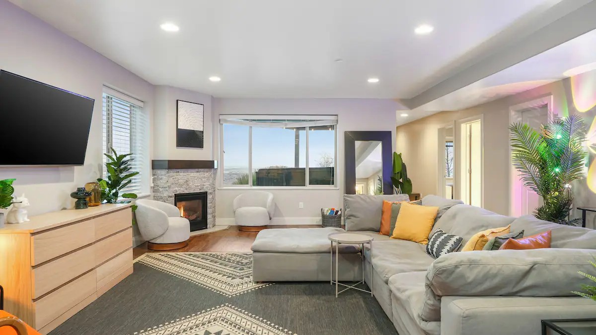 O interior está perfeitamente equipado para sessões de hangout em grandes grupos. Há uma lareira a gás na sala de estar com um sofá grande e um pátio pitoresco para apreciar a vista. Este último oferece uma vista incrível de Salt Lake City.