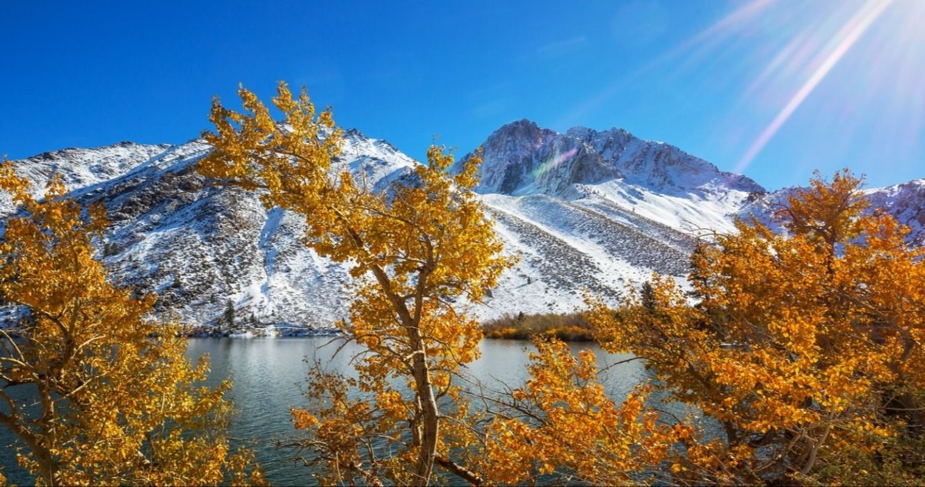 Folhagem de outono no outono e início do inverno nas montanhas de Sierra Nevada, Sierra Nevadas, CA, Califórnia, EUA