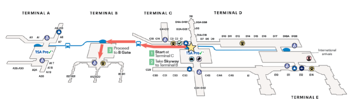 Porém, antes disso, os passageiros poderão esperar mudanças consideráveis em suas rotinas. Os portões do Terminal B (B3–B31) continuarão a funcionar enquanto os reparos estiverem em andamento, mas o saguão do terminal estará fechado. Os viajantes que voam com a United Airlines serão enviados para o Terminal C em vez do Terminal B, onde normalmente fazem o check-in e passam pela segurança. Para chegar ao portão de embarque no Terminal B, eles terão que usar o trem Skyway.