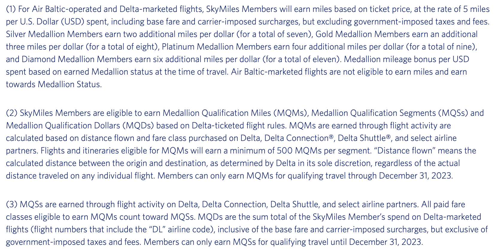 Os associados SkyMiles que voam em voos comercializados pela Delta e operados pela airBaltic ganham milhas e ganham status Medallion. Os números SkyMiles devem ser adicionados à reserva antes da viagem, mas dentro de nove meses do voo, pode solicitar um crédito retroativo. Algumas das regras sobre ganhos em voos da airBaltic estão na foto abaixo.