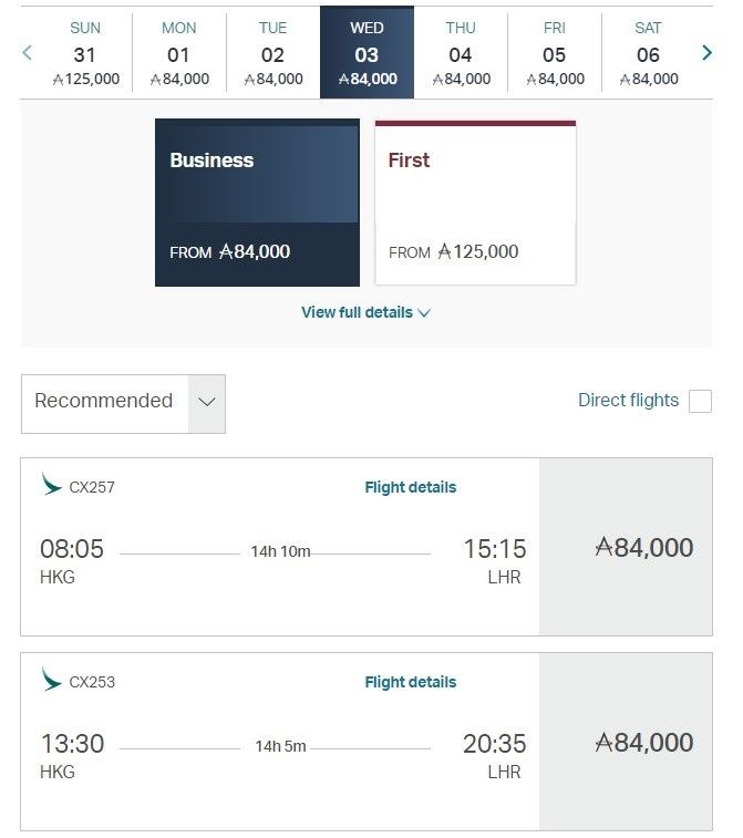 A reserva é simples online, com pesquisa flexível baseada em calendário (o exemplo abaixo é para voos próximos de Hong Kong a Londres).
