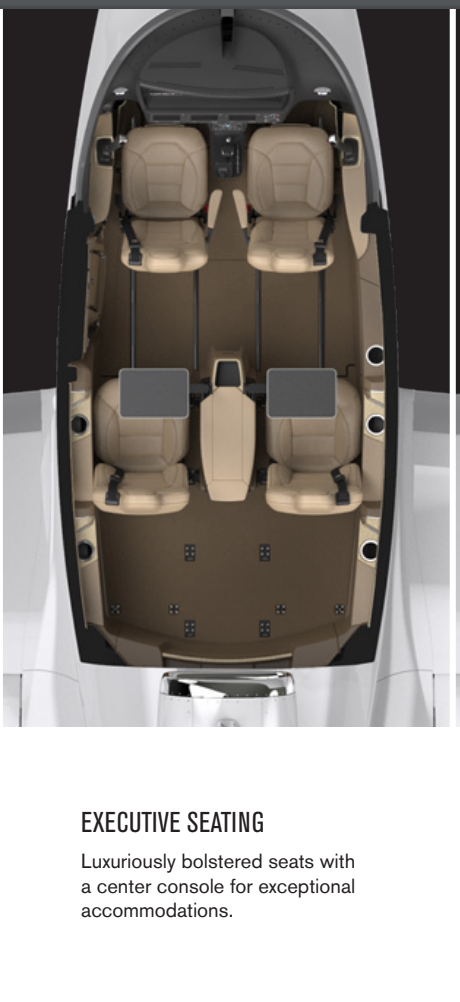 Há um assento reservado para o piloto; o assento ao lado deles pode ser usado por um copiloto (ou primeiro oficial) ou um passageiro, e atrás desta primeira fila de dois assentos está uma segunda fila de dois assentos, seguida por uma fila de três assentos. Este estilo de cabine é voltado para quem viaja em grupo, principalmente amigos ou familiares. É mais parecido com a utilidade de um carro familiar confortável do que com um jato executivo.