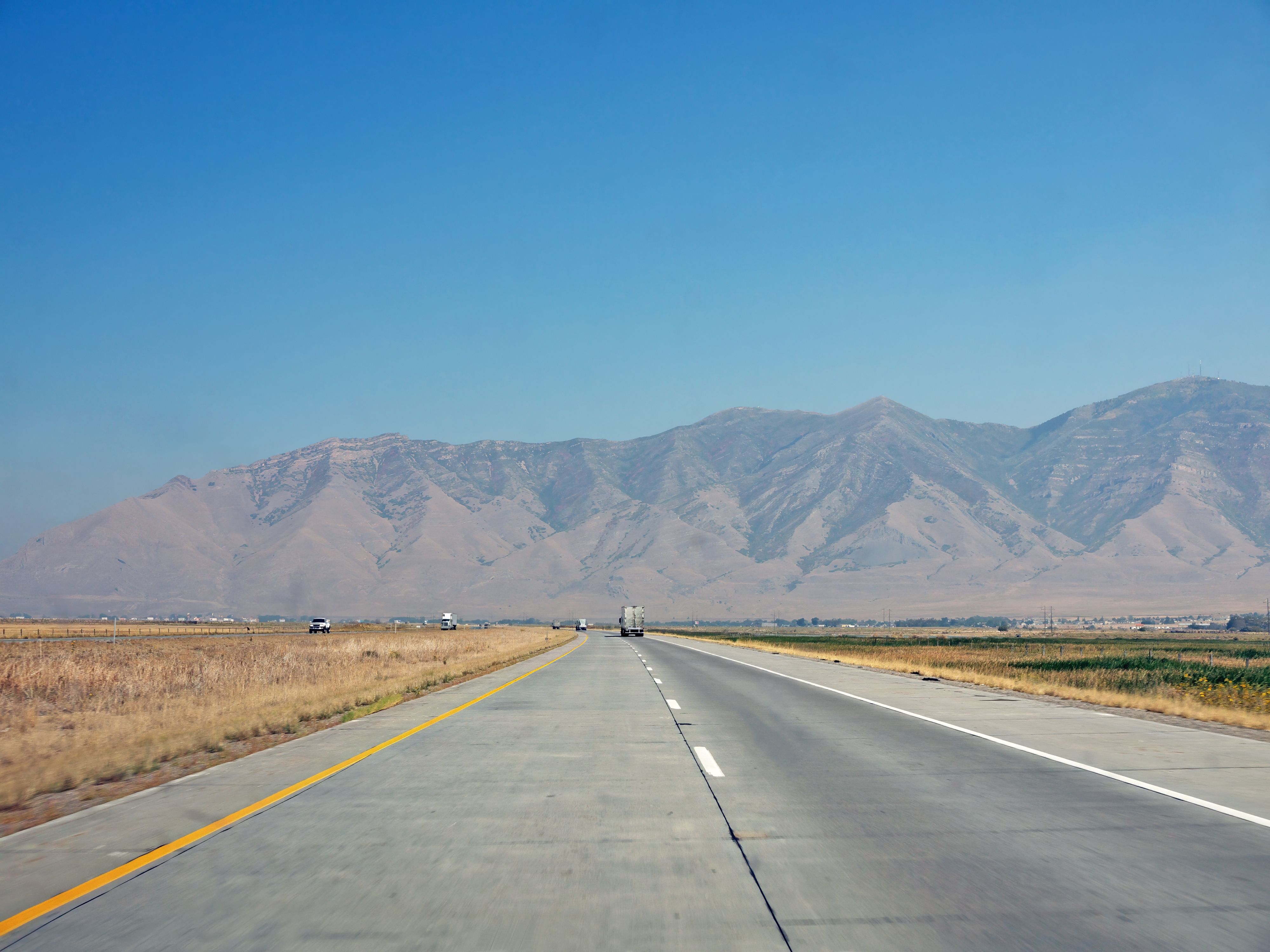 Dirigindo para a Cordilheira Oquirrh pela rodovia US Route 80 em dia ensolarado