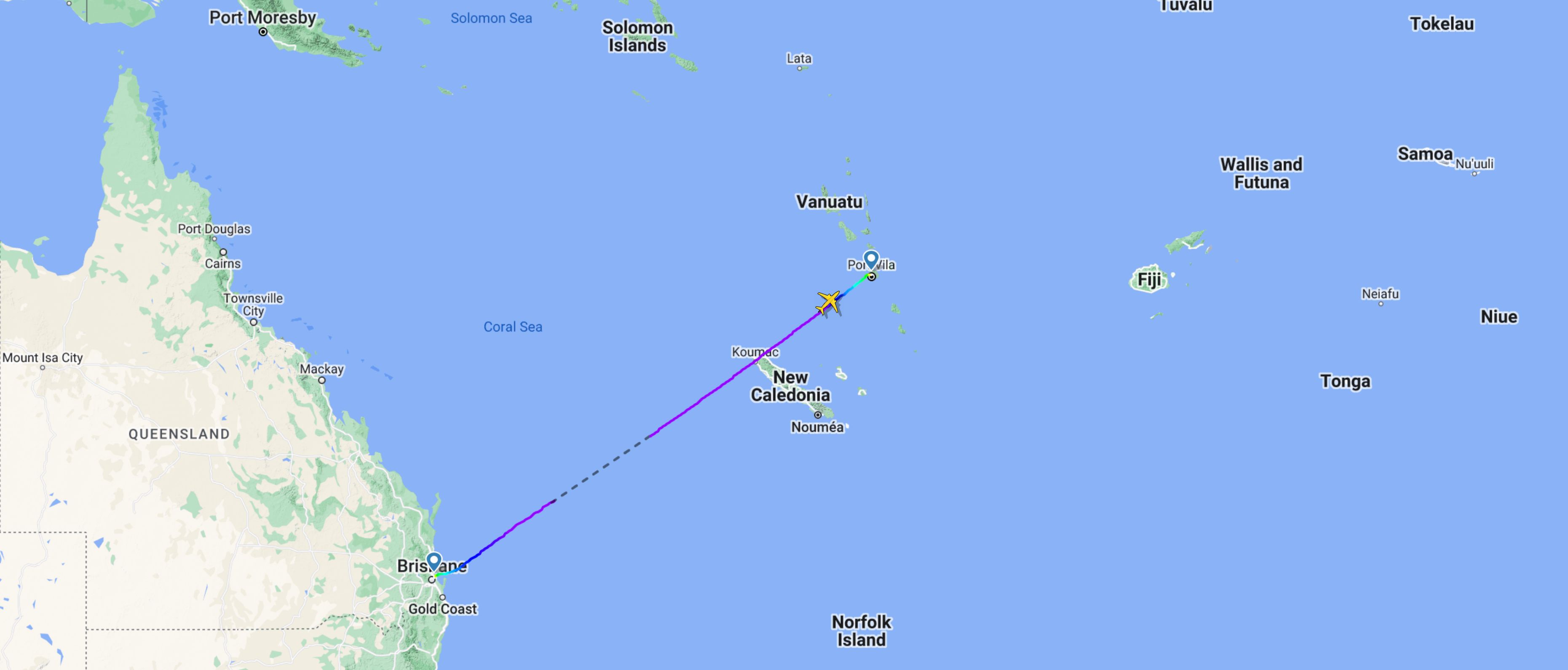 O voo QF159 da Qantas partiu do Aeroporto de Brisbane (BNE) às 11h46 de terça-feira e, após um voo de 2h14, pousou no Aeroporto Internacional Vanuatu Port Vila Bauerfield (VLI) às 14h59. O Boeing 737-800 2011, matrícula VH-VZU e MSN 34187, está programado para partir de Port Vila às 16h10 e retornar ao aeroporto de Brisbane às 18h15.