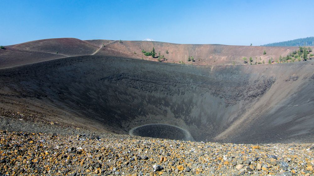 A trilha começa no Lago Butte, serpenteando por um caminho arenoso e cinza antes de chegar à subida íngreme e sinuosa do próprio cone. O esforço final até o cume é difícil, como subir uma duna feita de cascalho vulcânico solto, mas a recompensa vale a pena.