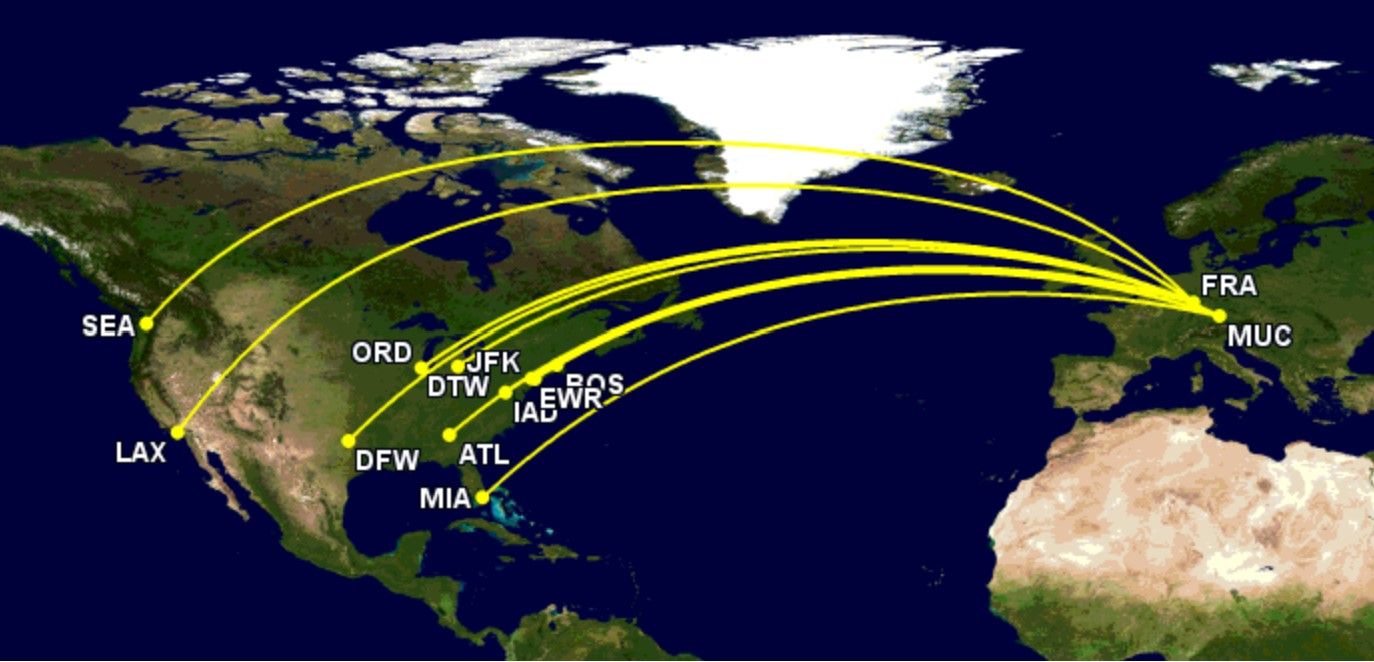 As companhias aéreas do Norte mudarão para os horários de verão em 31 de março, com base nas temporadas de slots da IATA. Muitas mudanças de rota e alterações de capacidade acontecerão nesta data ou próximo a ela. Examinando horários fornecidos pela Lufthansa paraOAGparaAbril-setembromostra que 11 aeroportos dos EUA verão o tipo de aeronave.