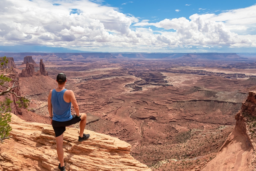 Homem com vista panorâmica do Buck Canyon visto do Mesa Arch perto de Moab, Canyonlands National Park
