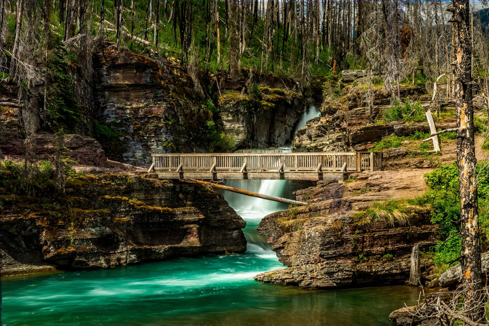 Outra atração acessível da geleira de St. Mary é a aparência místicaCataratas de Santa Maria. Também acessível por caminhada, esta cachoeira apresenta uma cor turquesa leitosa e três quedas distintas caindo em cascata de 35 pés em desfiladeiros rochosos e em piscinas antes de desaguar no Lago St. OIncêndio em Reynolds Creek 2015queimou grande parte da floresta densa, transformando a trilha de St. Mary Falls em uma área mais aberta e ensolarada.