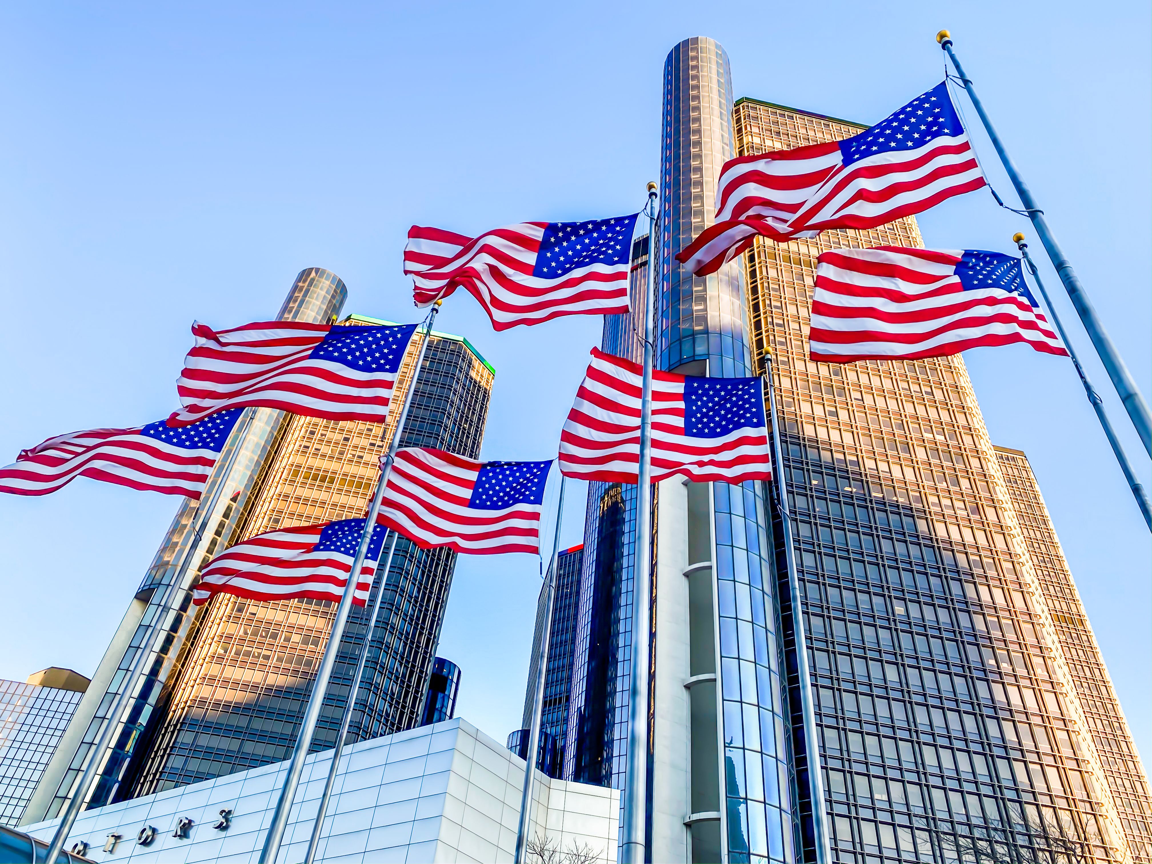 Bandeiras do centro da cidade de Detroit voando