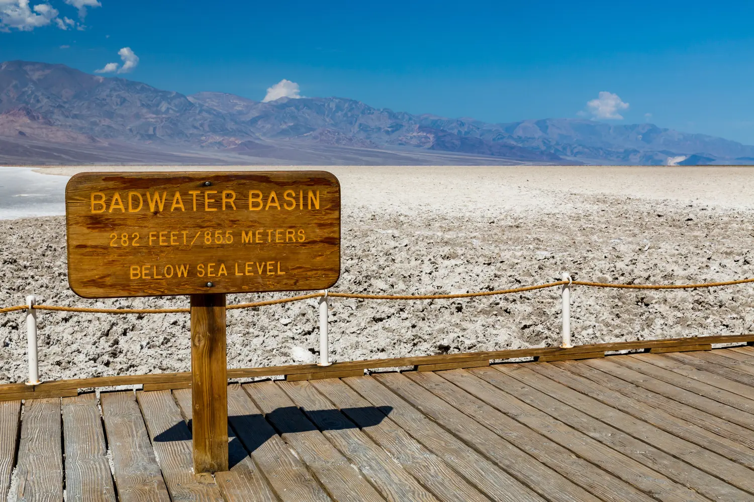 Badwater Basin, o ponto mais baixo da América do Norte, é imperdível no parque. Esta área já foi o local de um antigo lago que evaporou há dezenas de milhares de anos, deixando para trás vastos depósitos de sal. Hoje, polígonos geométricos de sal se estendem pelas planícies onde existia o Lago Manly.